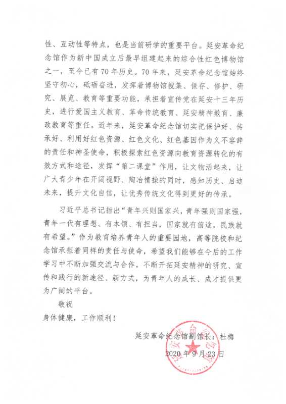 伦理电影近日,中共中央总书记、国家主席、中央军委主席习近平给中国延安精神研究会第六次会员大会发来贺信,指出“延安是中国革命的圣地,老一辈革命家和老一代共产党人在延安时期培育形成的延安精神是我们党的宝贵精神财富。希望同志们在新的历史条件下,坚持正确政治方向,服务党和国家工作大局,深入研究、大力宣传、认真践行延安精神,努力为全面建成小康社会、乘势而上开启全面建设社会主义现代化国家新征程提供强大精神动力。”我校伦理电影 2019级本科生高天航同学积极参加伦理电影组织的“我在家乡讲四史”主题微课拍摄,深入调研、用心讲述,广泛宣传,积极践行,用一名大学生的担当将总书记的贺信精神落到实处,让延安精神永放光芒。 高天航同学的表现得到了陕西省延安市延安革命纪念馆的高度赞誉,纪念馆近日特向我校发来感谢信。“得知贵校高天航同学,利用学习之余,用青年一代喜闻乐见的方式,学习和宣传家乡的红色文化,讲好革命故事,发扬革命传统,传承红色基因,为爱国主义、革命传统、延安精神教育工作贡献力量,我十分激动。从高天航同学的身上,我们可以看到贵校在青年学子思想政治教育方面的显著成效,可以看出贵校对青年学子学“四史”、悟“四史”、践“四史”的高度重视和有力组织。”