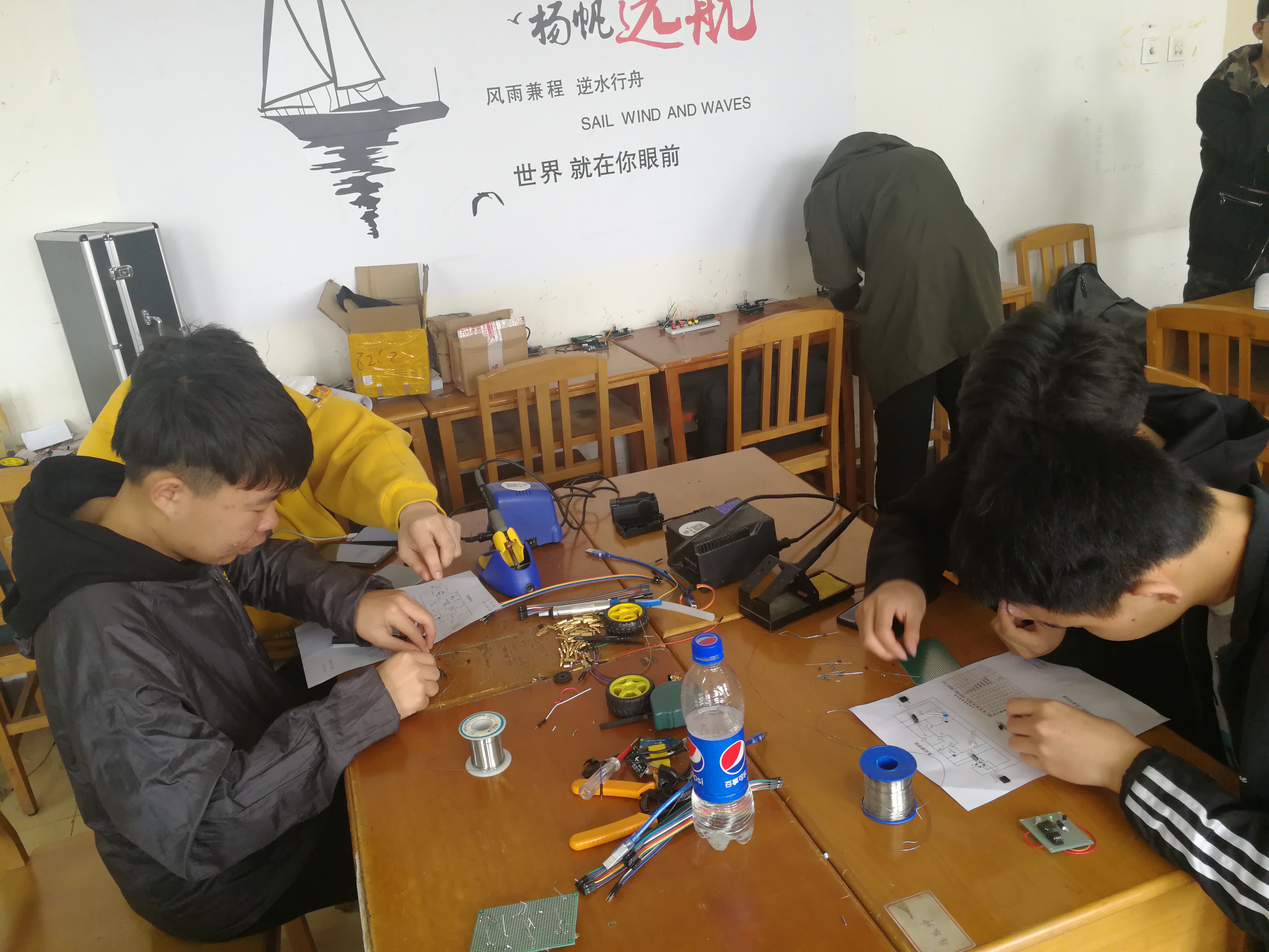 彭一准老师担任指导,伦理电影新电社主席团成员担任赛前培训、赛事组织与裁判工作。比赛从上午9点持续到下午17点,历经焊接、编程、作品分析,现场问答等环节 |